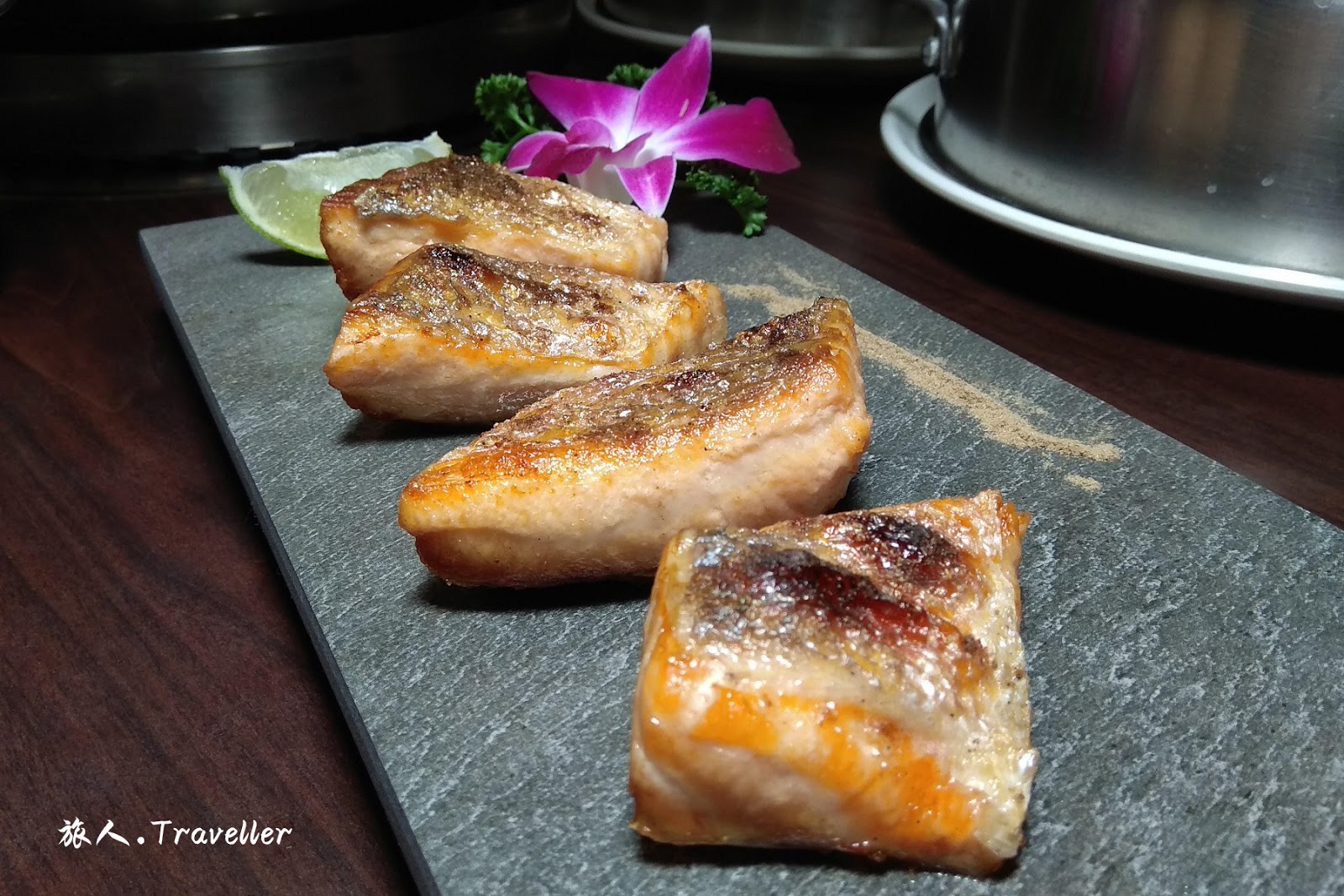 ⭕ 烤現流魚(鮭魚),這天店家選用的是鮭魚肚的部份,油脂豐富的鮭魚肚在合宜的火候烤製後,鮭魚油獨特的香味完美的呈現,不得不配服店家的烤功與對食材的嚴僅。