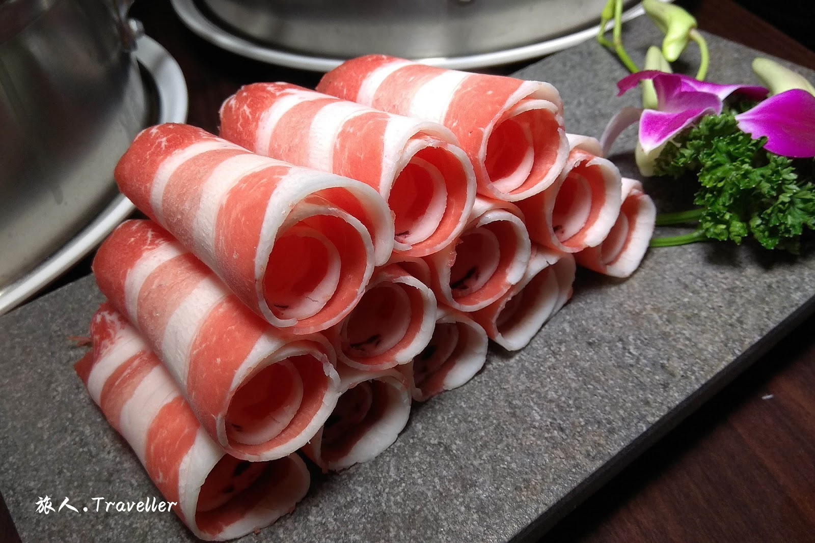 ⭕ 雪花牛,這是置於下層的火鍋中烹煮的,店家將肉的厚度掌控的很好,牛肉的油脂也分佈的很均勻,很棒的牛肉。