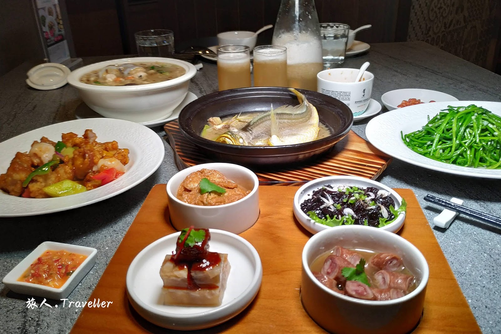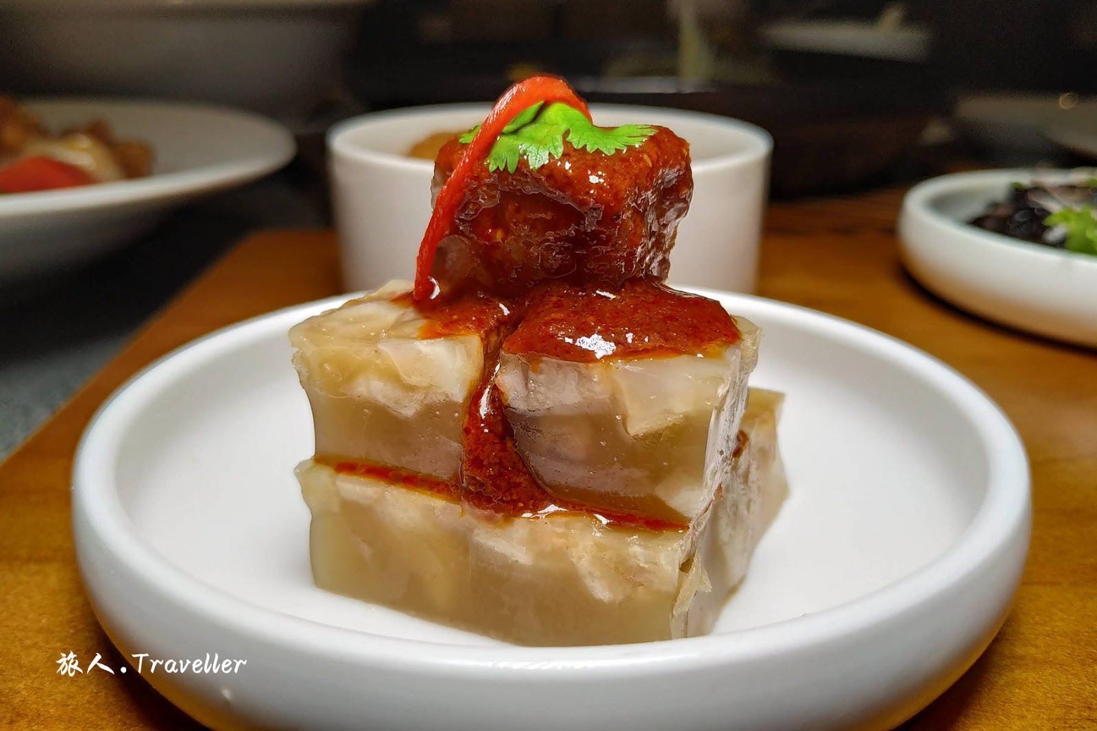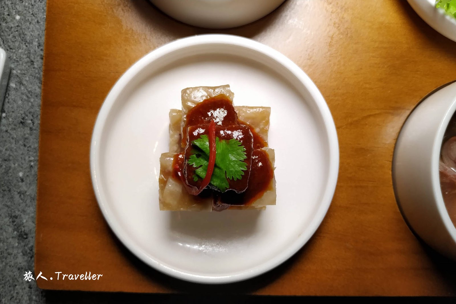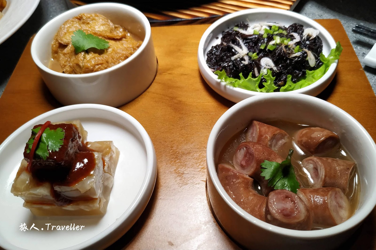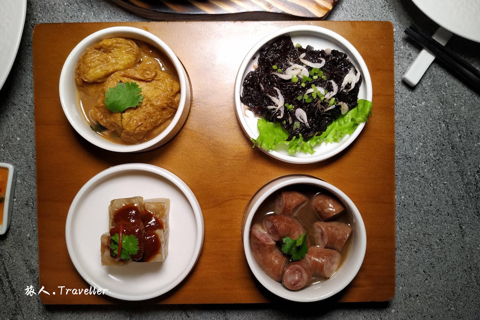 (九轉粉腸 Braised Pig Intestine, 蝦苗嫩紫菜 Seaweed and Mini Shrimps, 水晶豬蹄凍 Cold Pig’s trotter Jelly, 滷水嫰豆腐 Braised Homemade Bean Curd)
