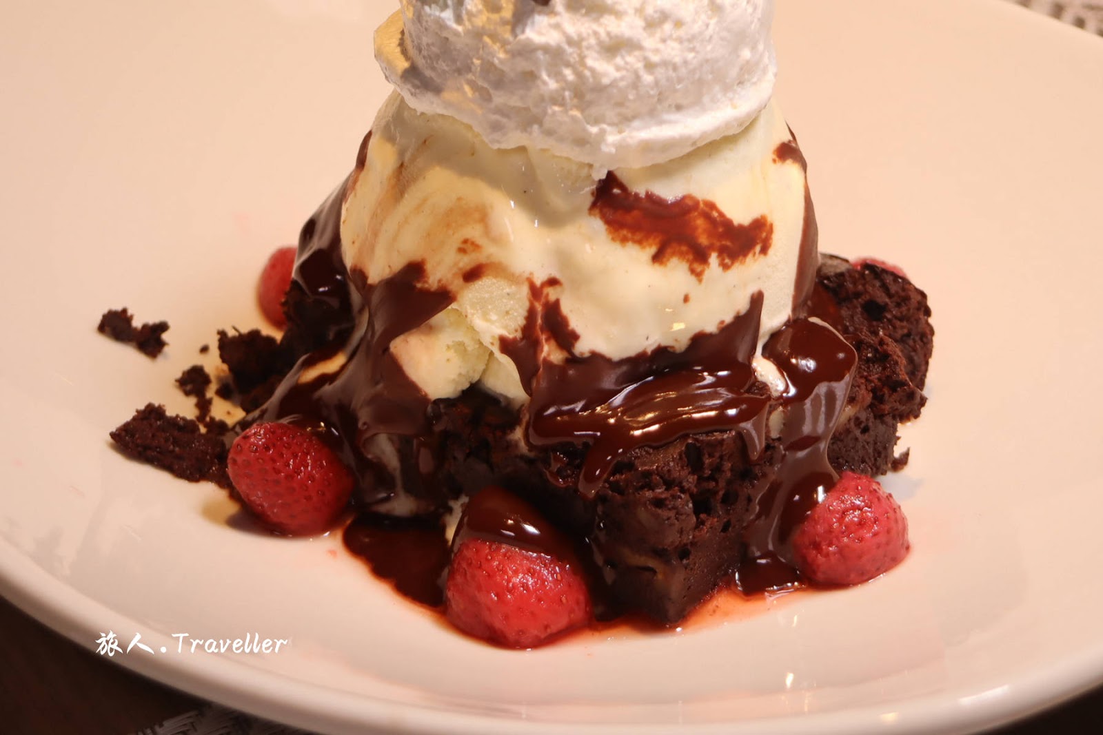 這道是『傑克兄弟牛排館』招牌甜點,使用高品質的比利時巧克力,手工自製布朗尼,上面再搭配香草冰淇淋與鮮奶油,品嚐時可由最上面的鮮奶油>冰淇淋>布朗尼>草莓,一挖到底一次入口,品嚐其冷熱交織的多層次美味口感。