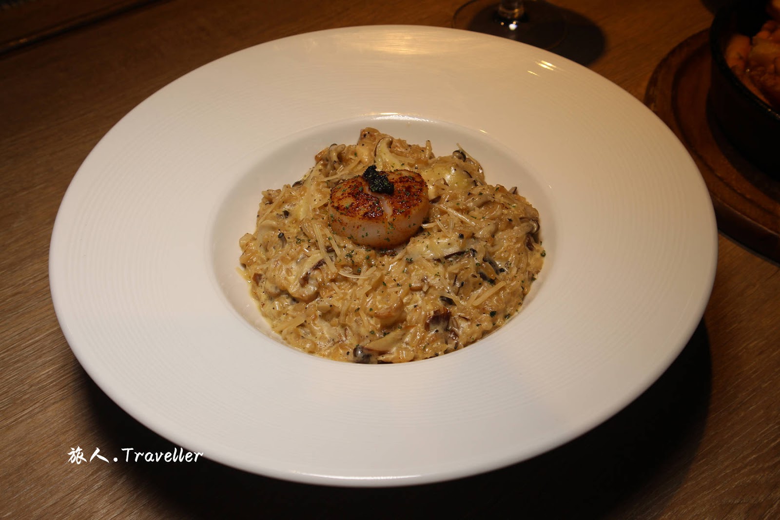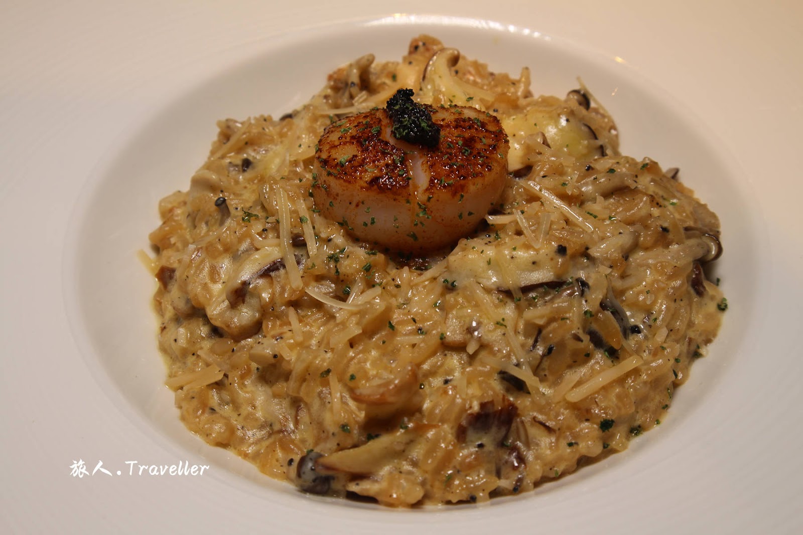 松露及牛肝蕈菇燉飯加入奶油白醬,撒上經10個月熟成的帕達諾帕瑪森起司,牛蕈菇的特殊香氣很是誘人。干貝使用的是北海道生食級干貝,吃起來相當鮮甜美味。干貝松露牛肝蕈菇燉飯吃起來口感滑順,米飯的軟硬度適中,帶有淡淡的松露鮮味,很另人印象深刻的一道料理。