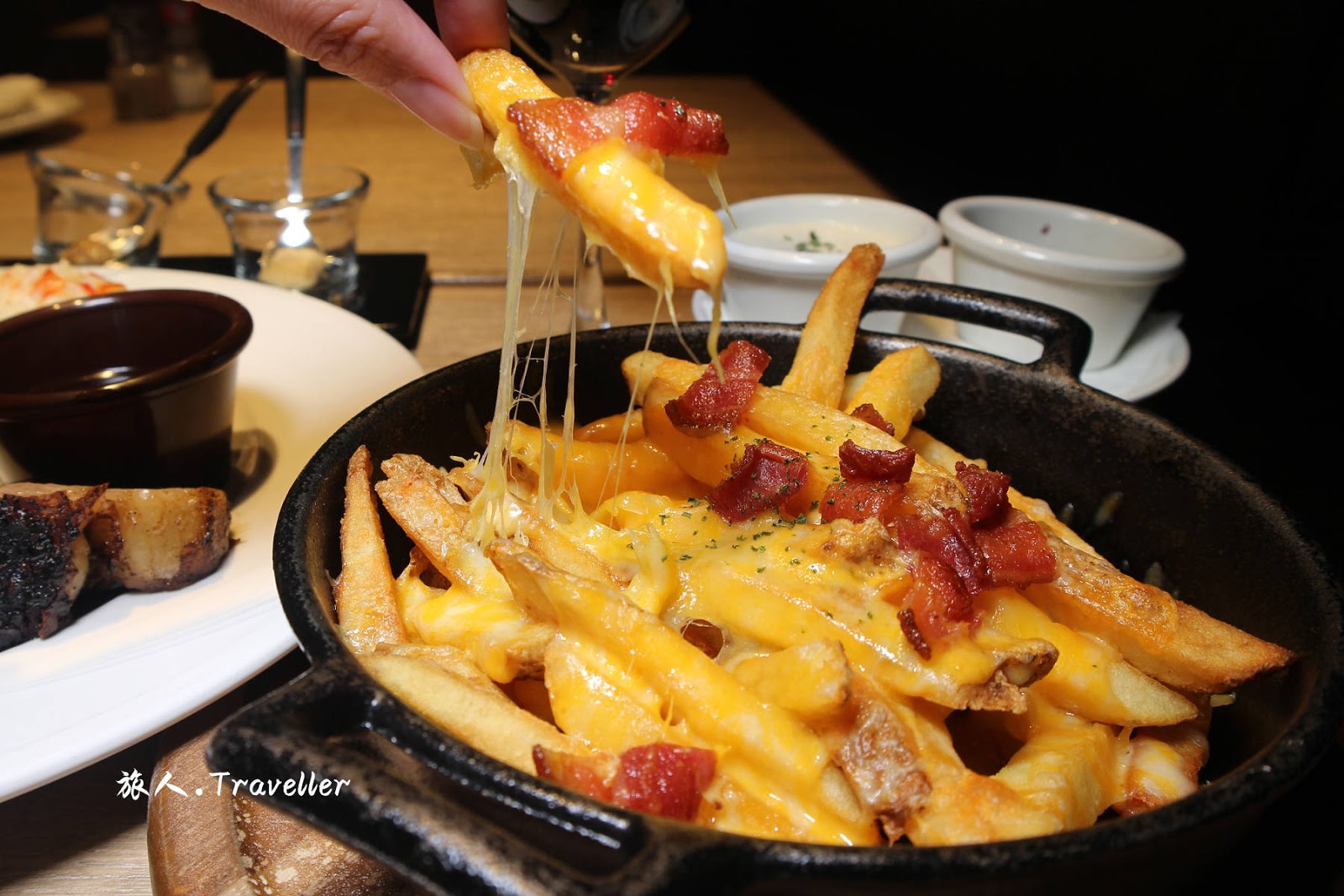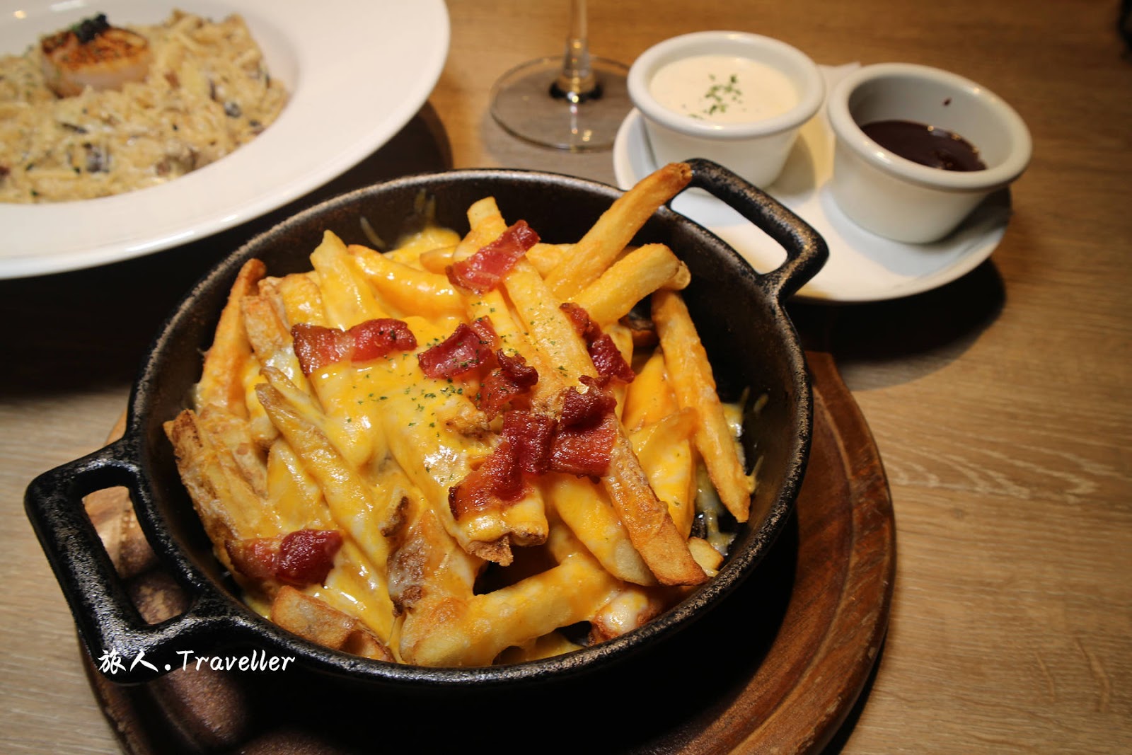 一看就知道是邪惡系料理,將炸得金黃的薯條,覆蓋上傑克與查特起司,焗烤至金黃色,再撒上碎培根增加口感與鹹香滋味,品嚐時可搭配現煮香濃比利時巧克力醬及法式鄉村醬。